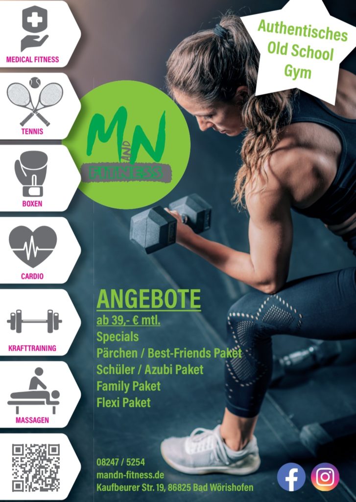 Das M&N-Fitnessstudio ist ein authentisches Old-School-Gym auf 2 Etagen mit insgesamt 300 qm² im wunderschönen Kurort Bad Wörishofen. Mit unserer attraktiven Stadtlage sind wir möglichst nah am Wohnort der Mitglieder gelegen und bieten trotz kompakter Größe alles, was ein effizientes Training braucht. Dazu gehören umfassende Geräte für Krafttraining, Funktionale Elemente, wie Battle Rope und Plyobox, ein Boxraum und eine Auswahl an Cardiogeräten. Da die Fläche begrenzt ist, gibt es keine Kursräume oder Wellness. Der Fokus liegt bei uns voll auf dem Training.
